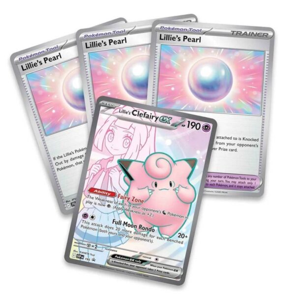 La fortaleza de Lillie, una Entrenadora valiente y cariñosa, reside en el vínculo que la une a sus Pokémon. Clefairy ex de Lillie, que llega como carta promo holográfica, pondrá contra las cuerdas a los Pokémon de tipo Dragón, ¡y se volverá más fuerte gracias a sus amistades en la Banca! Adentro también encontrarás 3 copias de Perla de Lillie, una carta de Herramienta Pokémon que ayudará a los Pokémon de Lillie, además de sobres de refuerzo, 1 divertida calcomanía, fundas ilustradas para cartas, 1 caja ilustrada para tu mazo, y otros accesorios para jugar a JCC Pokémon.
